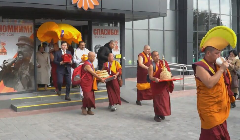 На кадрах верующие выносят драгоценный груз из самолета. Также на видео молебен с участием посла Индии в РФ Виная Кумара, руководителя Центрального духовного управления буддистов Геше Йонтена и главы Калмыкии Бату Хасикова.