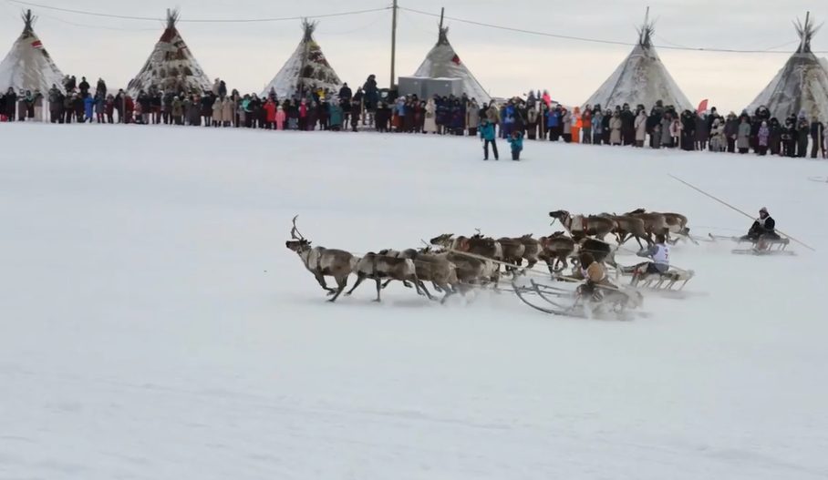 На кадрах, снятых в Салехарде, участники мероприятия мчатся на санях по заснеженному полю. Также на видео из Губкинского местные жители участвуют в соревнованиях по борьбе и метанию тынзяна на хорей (дисциплина северного многоборья, связанная с охотой на оленей).