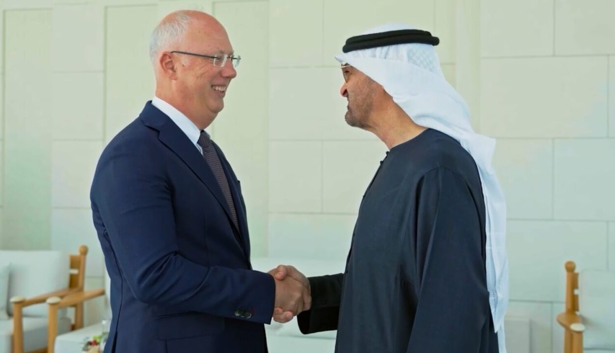 Глава Российского фонда прямых инвестиций (РФПИ) Кирилл Дмитриев встретился с президентом Объединенных Арабских Эмиратов Мухаммедом Бен Заидом Аль Нахайяном в Абу-Даби в воскресенье. На кадрах представитель РФ общается с лидером ОАЭ.