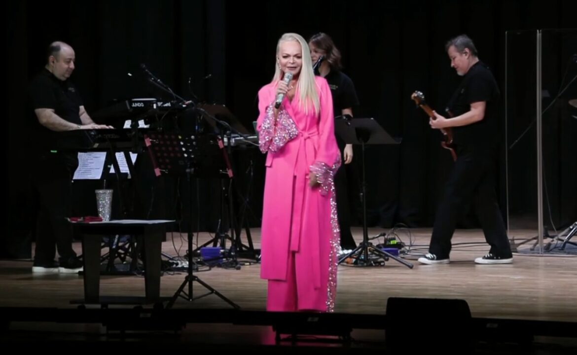 На кадрах артистка выступает перед зрителями на площадке городского Дворца культуры и спорта «Мир».