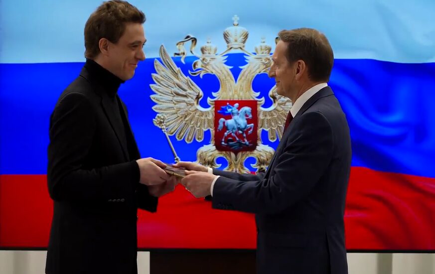 На кадрах директор СВР Сергей Нарышкин вручает документы дочери разведчика Изольде и его внуку Димитрию.