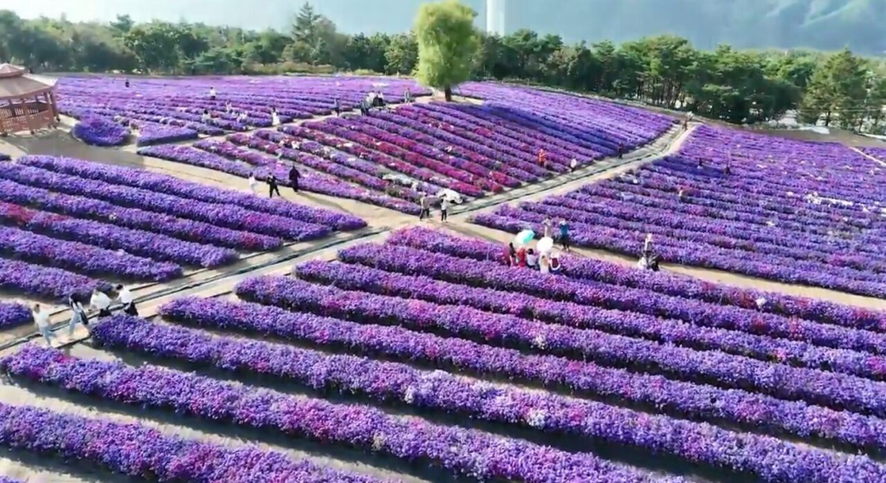 На снятых во вторник кадрах посетители гуляют по усыпанному фиолетовыми цветами склону горы Гамаксан.