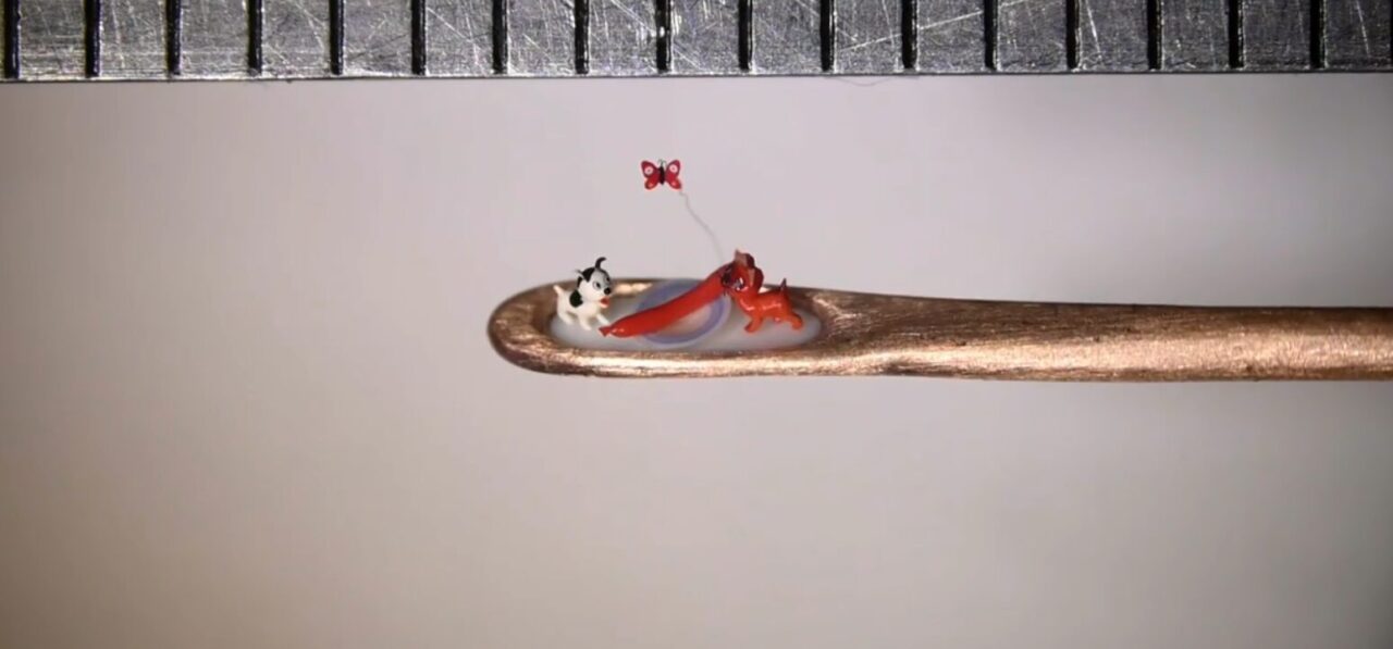 Художник-миниатюрист из Новосибирска Владимир Анискин представил новую работу — крошечную композицию с героями советского мультфильма «Котенок по имени Гав». Фигурки высотой около миллиметра поместились в ушке швейной иглы.