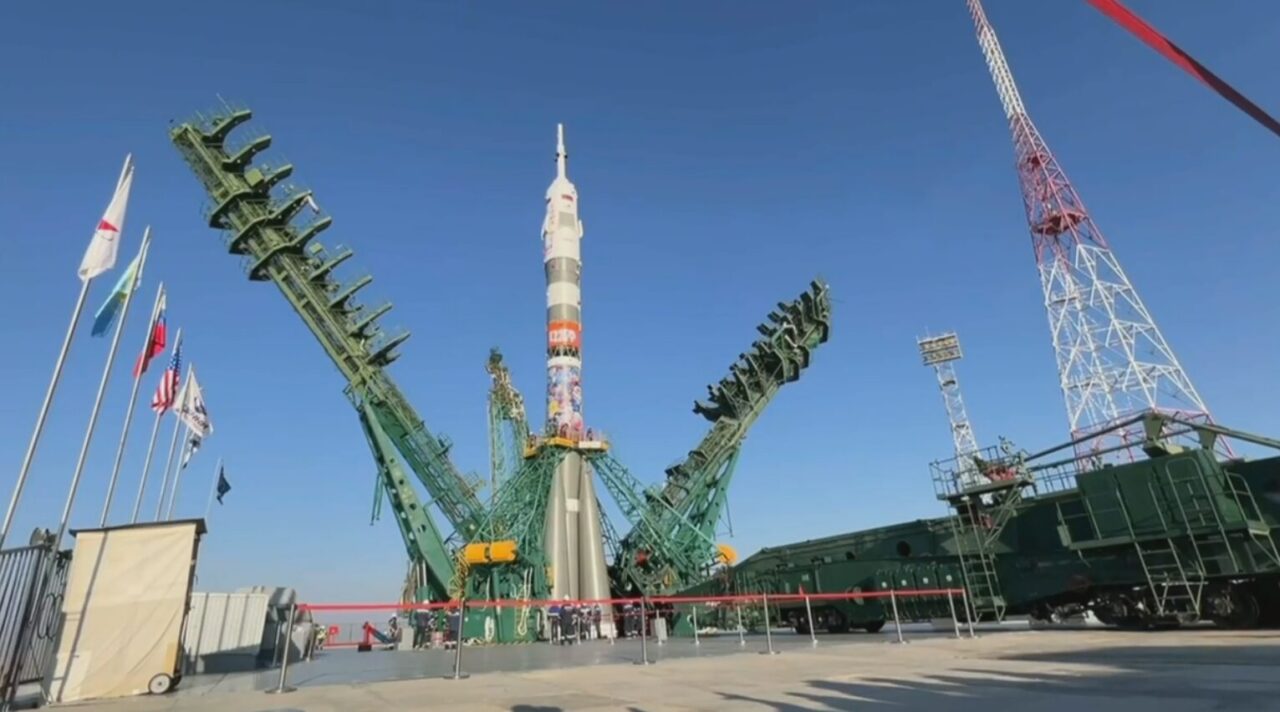 «Ракета с пилотируемым кораблем — на старте Байконура! После установки в вертикальное положение на стартовом комплексе специалисты «Роскосмоса» продолжили готовить ее к пуску», — говорится в сообщении госкорпорации.