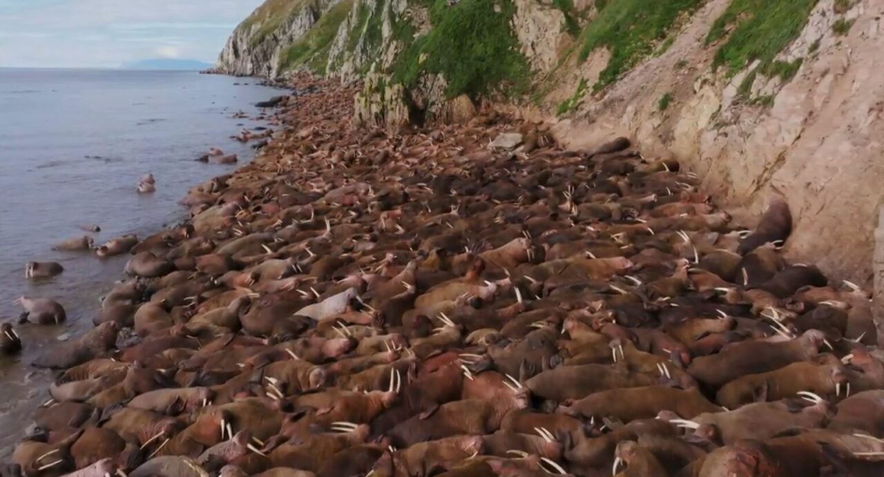 Сотни моржей попали в объектив видеокамеры во время отдыха у берегов острова Ратманова на Чукотке.