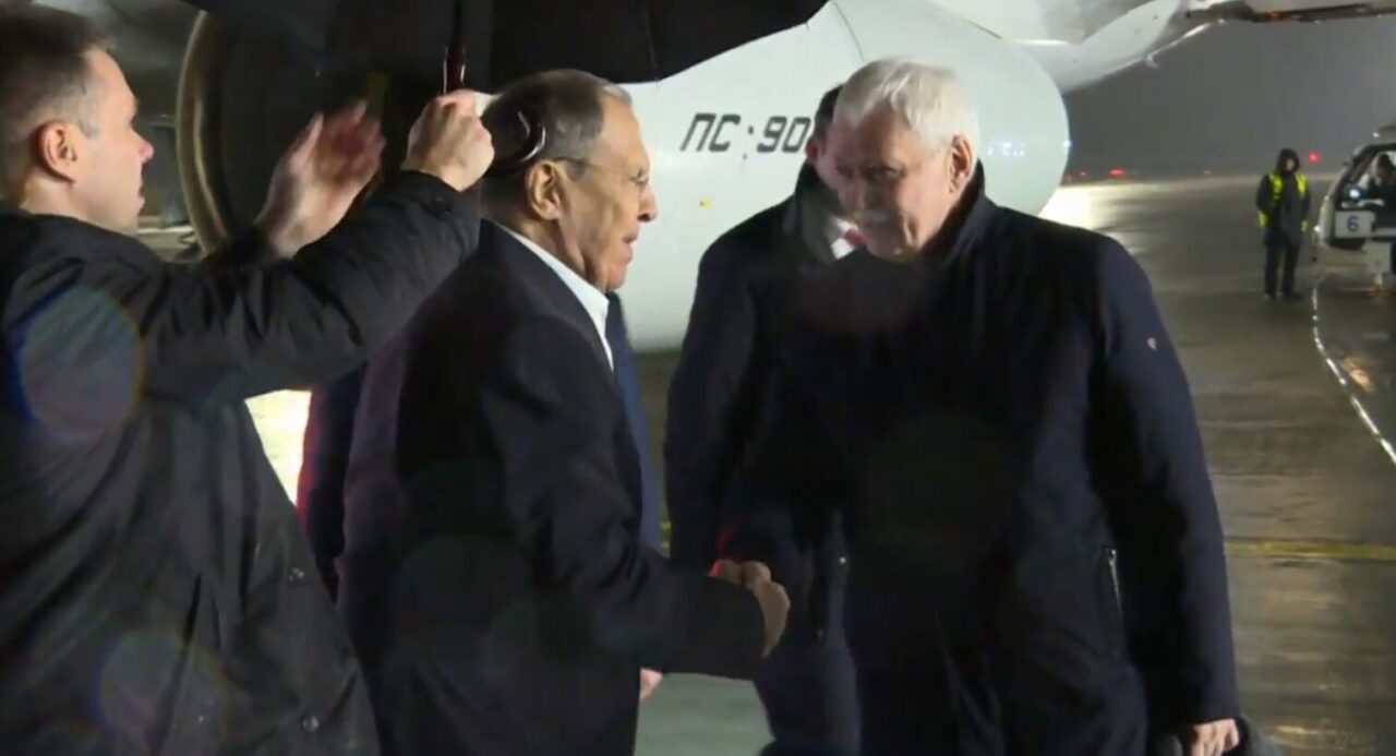 На кадрах Лавров спускается по трапу, где его встречает посол РФ в Белоруссии Борис Грызлов.