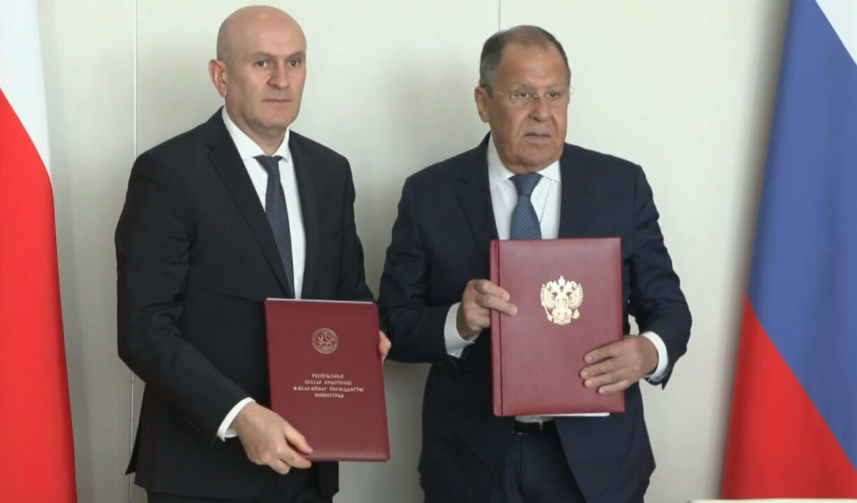 Министр иностранных дел России Сергей Лавров встретился с главами МИД Южной Осетии и Абхазии Ахсаром Джиоевым и Олегом Барцицом в Сочи в среду.