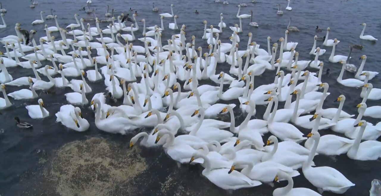 На кадрах, снятых 21 декабря, пернатые белым облаком плавают по зеркальной глади и радуют туристов.