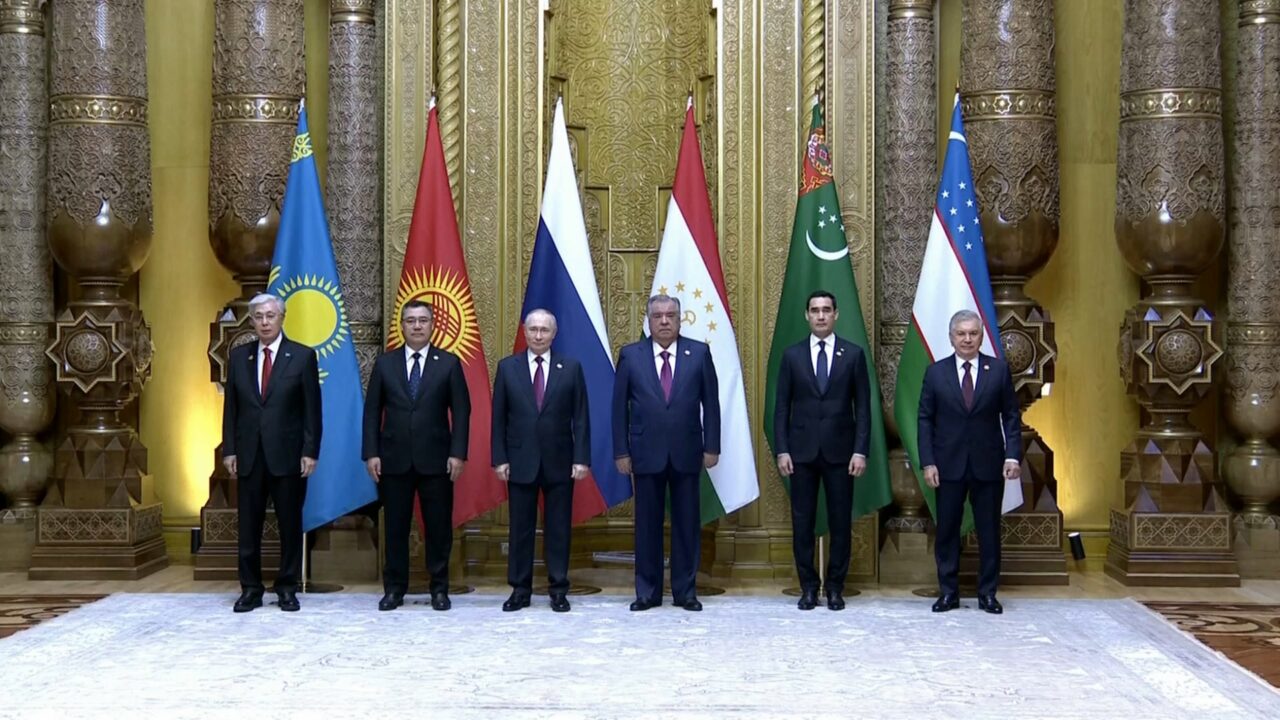 На кадрах президенты России, Казахстана, Кыргызстана, Узбекистана и Туркменистана Владимир Путин, Касым-Жомарт Токаев, Садыр Жапаров, Шавкат Мирзиёев и Сердар Бердымухамедов заходят во Дворец Наций и обмениваются рукопожатиями с лидером Таджикистана Эмомали Рахмоном. Также на видео главы государств фотографируются.