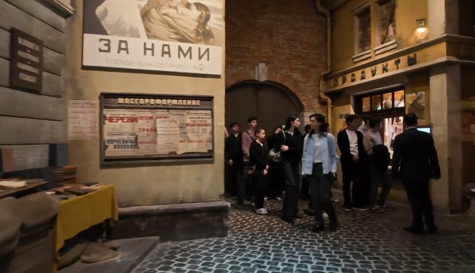 На кадрах, снятых в пятницу, участники осматривают экспозиции: интерактивную инсталляцию бомбоубежища, стилизованную под станцию метро «Маяковская», реконструкцию разрушенной крыши Театра имени Вахтангова после авиаудара во время ВОВ, а также залы с военными артефактами, техникой и мультимедийным архивом.