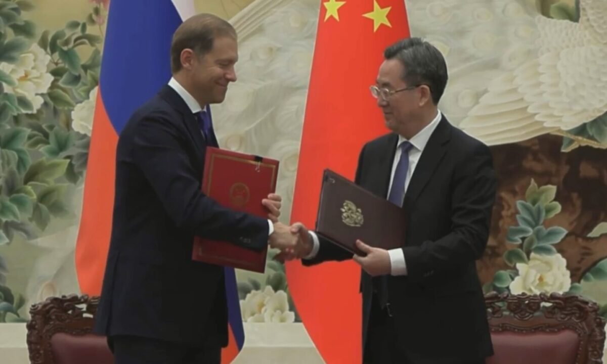 На кадрах Мантуров и заместитель премьера Госсовета КНР Дин Сюэсян проводят встречу, после чего подписывают документы.