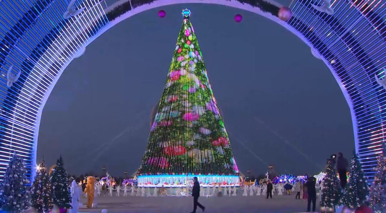 Главная новогодняя елка Туркменистана засияла на площади перед культурно-развлекательным центром «Алем» в Ашхабаде во вторник.
