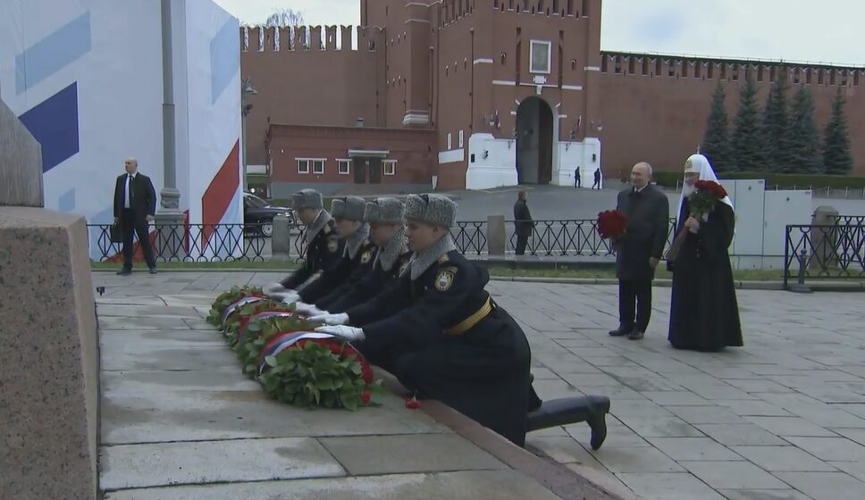 Президент России Владимир Путин возложил цветы к памятнику предводителям Второго народного ополчения 1612 года — Минину и Пожарскому — во вторник, в День народного единства.
