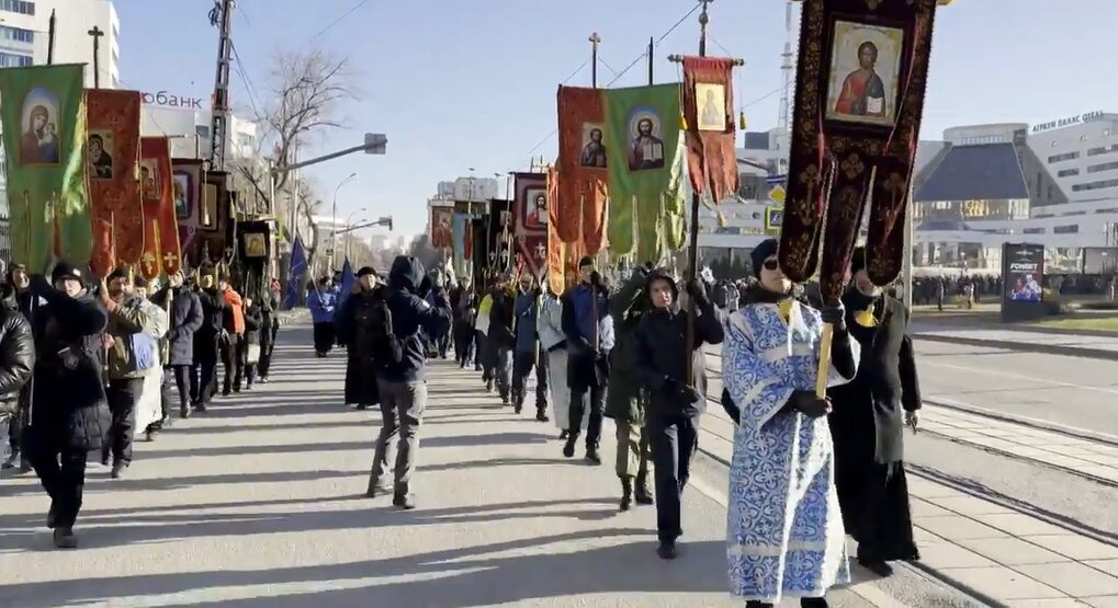 На кадрах местные жители и священнослужители с иконами, хоругвями и флагами идут по улицам города.