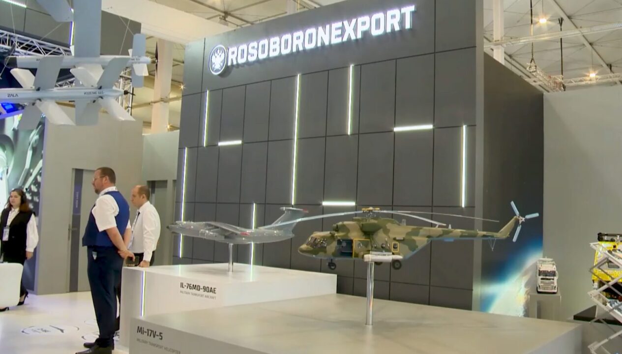 На кадрах, снятых в понедельник, стенды отечественных компаний с моделями оружия, макетами БПЛА, боеприпасов и военной техники.