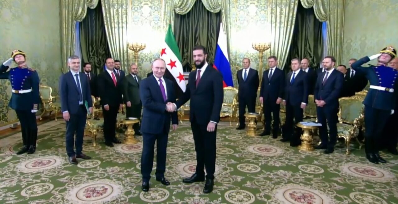 Президенты России и Сирии Владимир Путин и Ахмед Шараа обменялись рукопожатиями перед началом встречи в Москве в среду.
