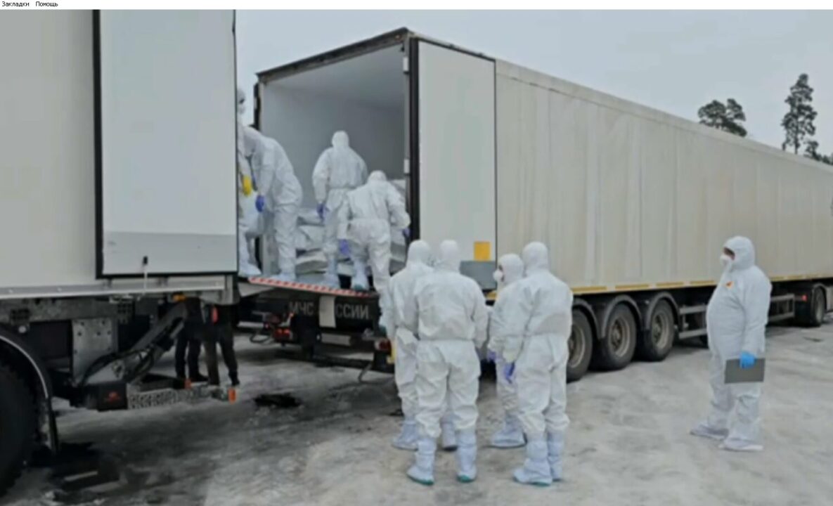 На снятых в четверг кадрах специалисты в защитных костюмах переносят тела из фургонов-рефрижераторов.