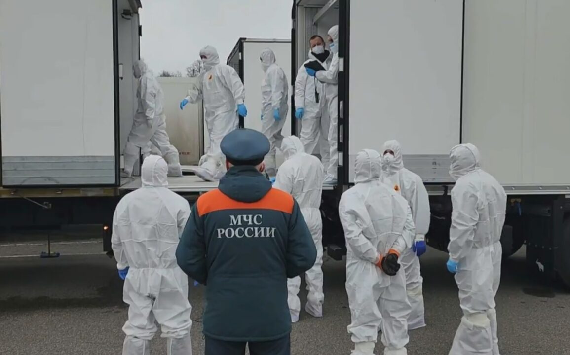 На кадрах, опубликованных в четверг, специалисты в защитных костюмах перегружают тела из фургонов-рефрижераторов.