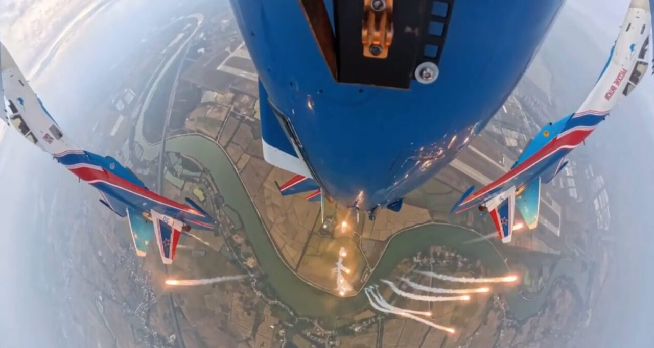 «Летчики пилотажной группы «Русские Витязи» показали групповые фигуры высшего пилотажа, такие как «петля Нестерова», «бочка», «вираж», на установленных интервалах и дистанциях, а также парный, одиночный и встречный пилотаж», — уточнили в Минобороны.