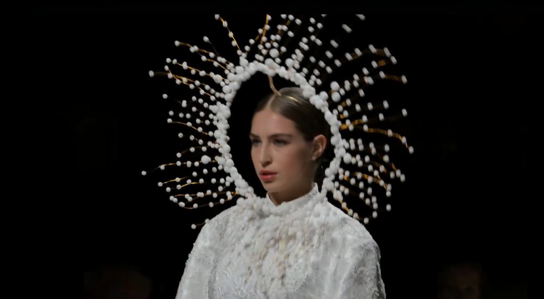 На кадрах женщины и мужчины дефилируют по подиуму в ярких нарядах со стразами, перьями и необычными аксессуарами.