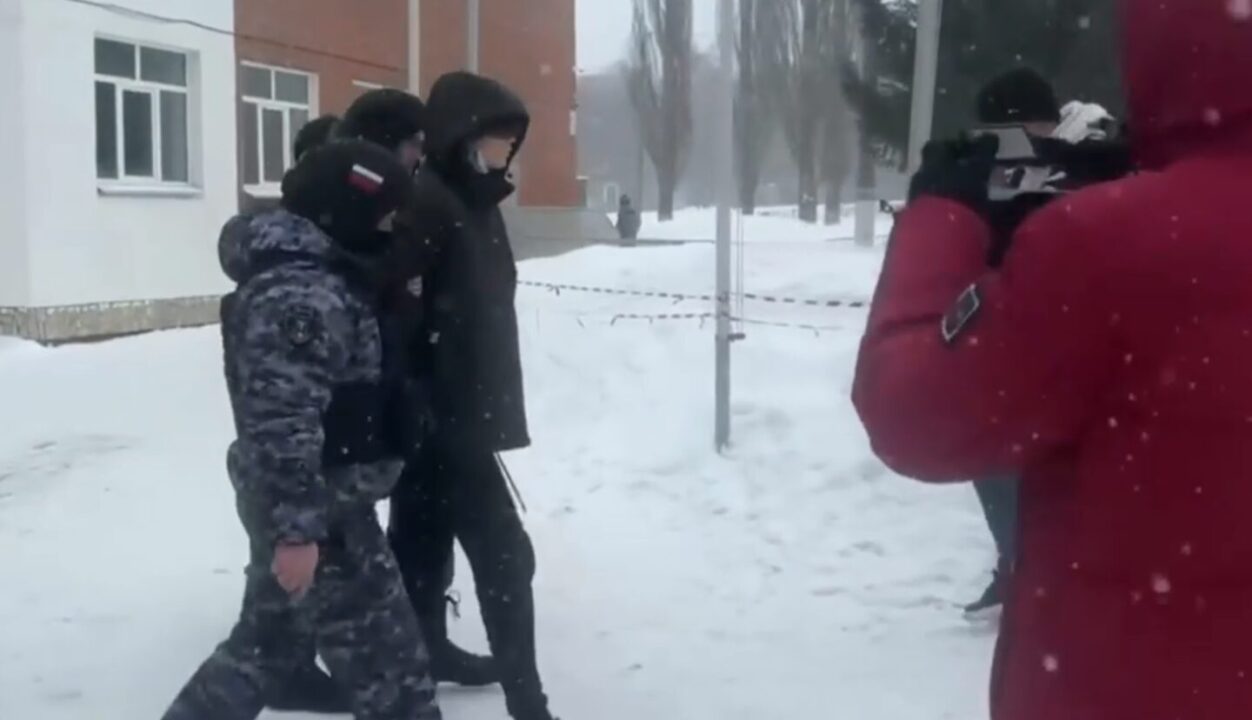 На кадрах силовики уводят подростка с территории учебного заведения.