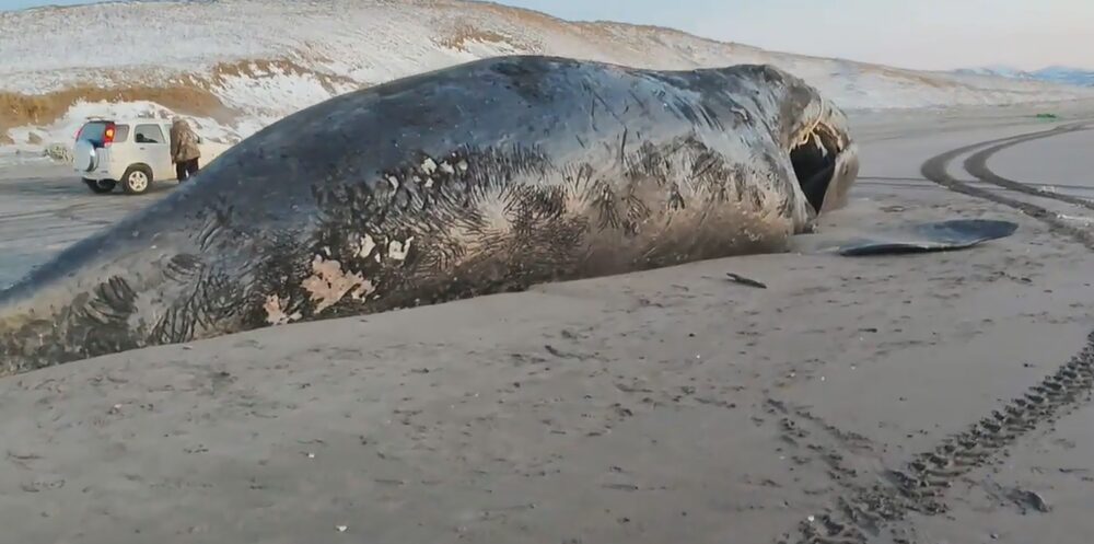 Тушу японского кита длиной около 20 метров выбросило на берег Охотского моря.