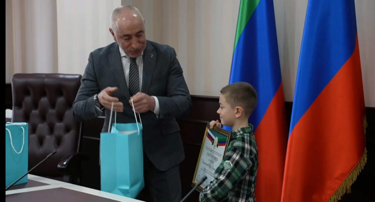На кадрах, снятых 30 января, глава МЧС Дагестана Нариман Казимагамедов награждает мальчика почетной грамотой.
