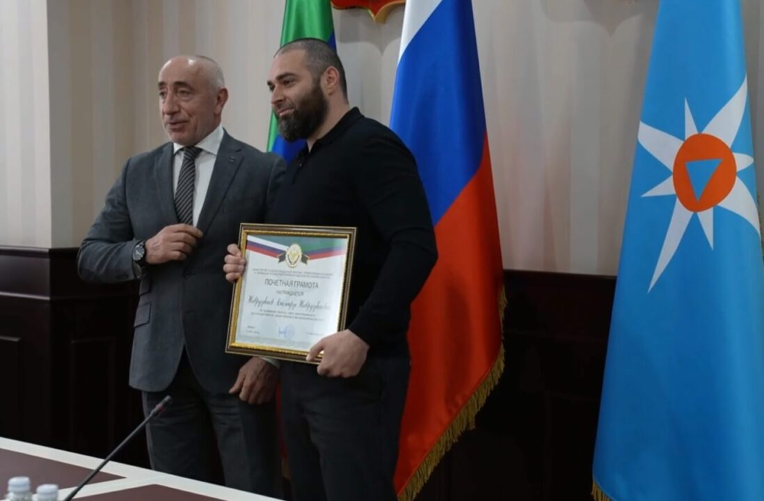На кадрах, снятых в пятницу, министр по делам гражданской обороны, чрезвычайным ситуациям и ликвидации последствий стихийных бедствий Дагестана Нариман Казимагамедов вручает почетные грамоты Асадуле Магомедову, Алимирзе Наврузбекову и Абдулсамаду Омарову.