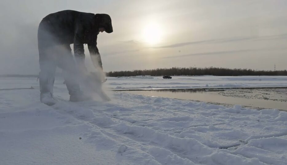 На кадрах, снятых в пятницу, рабочие распиливают ледяной покров бензопилой, поднимают глыбы на специальные сани и грузят готовые блоки в автомобиль.