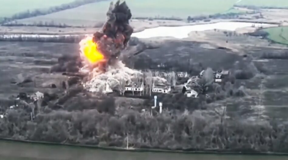 На кадрах, снятых с дрона, взрыв, после которого густой дым поднимается над постройкой.